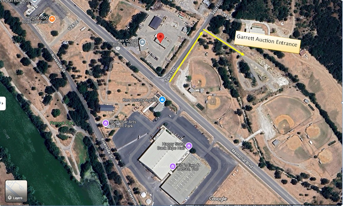 THE SITE for the May 10 auction of Kerr County Road and Bridge Department surplus equipment and tools will be at 150 Spur 100 in Kerrville, Texas. (The entrance directions are highlighted in yellow on this map.) The live event will start at 10 a.m., but online bids are possible now. – Map courtesy Kerr County Road & Bridge