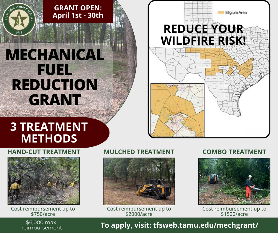 The Texas A&M Forest Service Mechanical Fuel Reduction Grant can reimburse a property owner’s costs up to $750 per acre for hand cutting, up to $2,000 per acre for mulching or up to $1,500 per acre for a combination of both – with a max reimbursement of $6,000.